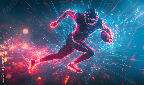 Dynamic Neon Football Action with Futuristic Geometric Patterns and Vibrant Light Trails for High-Energy Sports Advertising Backgrounds