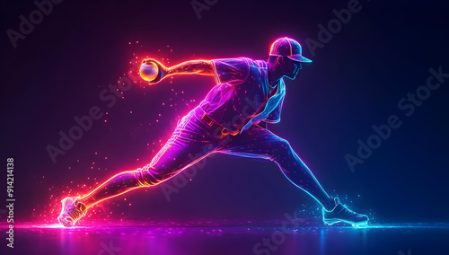 Dynamic neon illustration of a baseball player in motion, capturing the energy and excitement of sports performance.