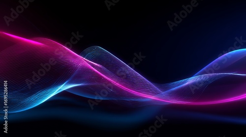 Dynamic neon waves of vibrant magenta and electric blue flow across a dark, futuristic background creating an energetic abstract visual.