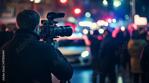 Dynamic news reporter on the scene of a breaking story, surrounded by a bustling crowd and flashing police cars in the background. Capturing the urgency and immediacy of real-time journalism