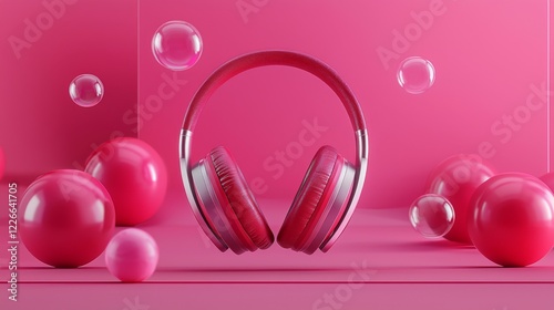 Dynamic pink headphones floating amid bubbles studio setup product display colorful environment eye-level view fun concept