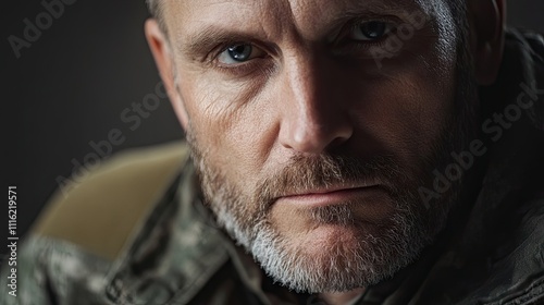 Dynamic portrait of a military veteran reflecting deeply, embodying strength and resilience. This image captures a military veterans reflective gaze with ample space for text or branding.