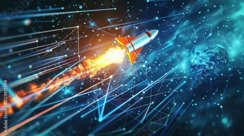 Dynamic Rocket Launch: Digital Illustration with Glowing Blue Lines and Abstract Connections