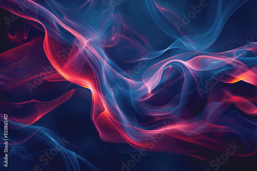 Dynamic smoke swirls dark red. Accented with neon blue textures and warm tones.