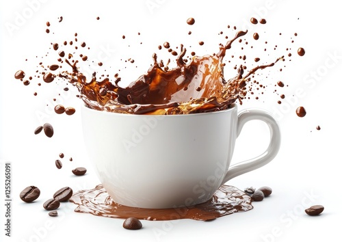Dynamic splash of hot chocolate from a white cup with coffee beans scattered around