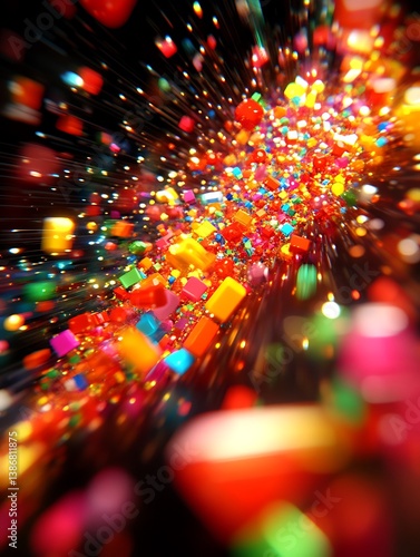 Dynamic splash of prismatic cubes with radiant light trails abstract