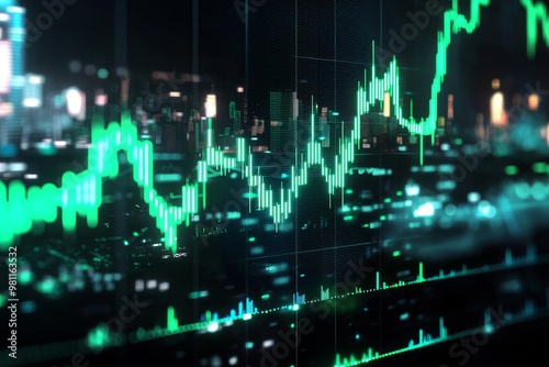 Dynamic stock market chart displaying fluctuating green lines against a dark city backdrop, symbolizing financial growth. illustration