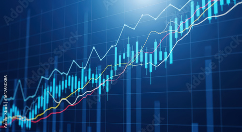 Dynamic Stock Market Chart with Rising Trends and Multiple Indicators on a Blue Background Illustrating Financial Growth and Investment Opportunities