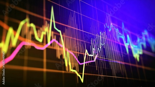 Dynamic stock market data with vibrant colorful graphs on dark background,
