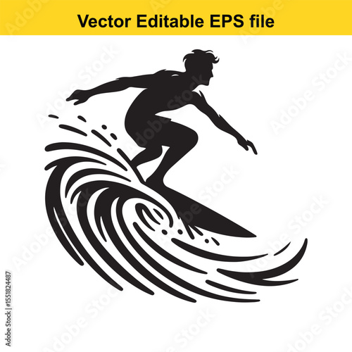 Dynamic Surfer Silhouette Riding a Powerful Wave Vector Illustration for Sports and Recreation Enthusiasts Graphic Arts