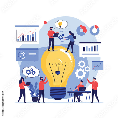 Dynamic team brainstorms innovative ideas around giant lightbulb for business growth and success