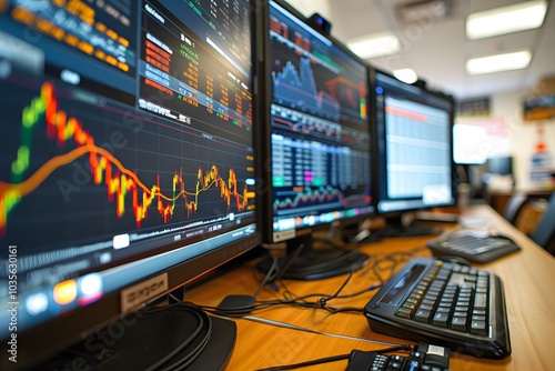 Dynamic Trading Setup with Multiple Monitors Displaying Stock Market Data