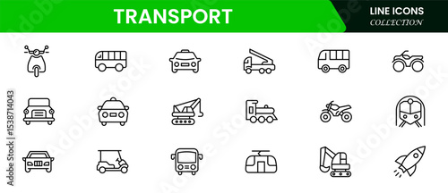 Dynamic vector web line icons depicting transport, vehicles, logistics, travel, and infrastructure for seamless mobility and global connectivity solutions.