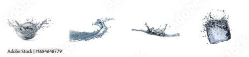 Dynamic water splashes and abstract liquid forms on transparent background, cut out
