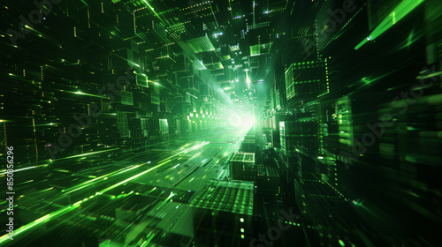 Dynamic Zoom Out of Neon Green Digital Cube with Motion Effect, Featuring Strong Metal and Machine Elements