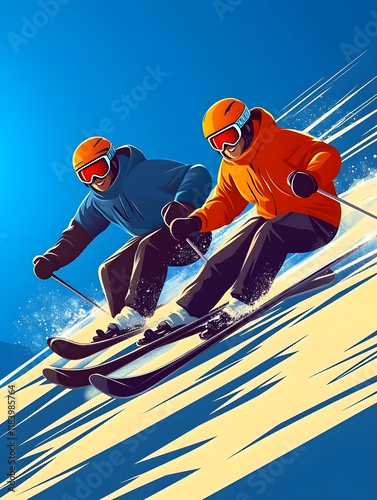 Dynamische Ski-Illustration mit zwei Skifahrern in leuchtenden Farben