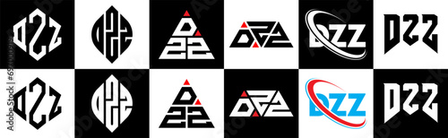 DZZ letter logo design in six style. DZZ polygon, circle, triangle, hexagon, flat and simple style with black and white color variation letter logo set in one artboard. DZZ minimalist and classic logo