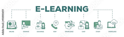E learning icon infographic illustration concept with icon of online, seminar, exchange, voip, knowledge, chat, study and download icon png and easy to edit