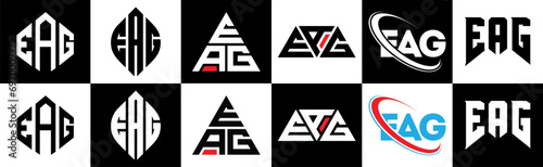 EAG letter logo design in six style. EAG polygon, circle, triangle, hexagon, flat and simple style with black and white color variation letter logo set in one artboard. EAG minimalist and classic logo