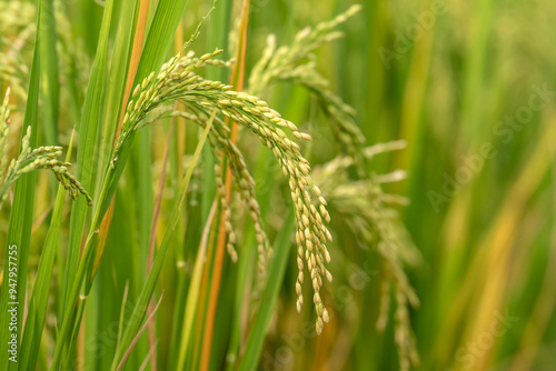 Ear of rice. Close up to rice seeds in ear of paddy in Thailand.