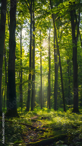 Early Morning Serenity in a Lush Forest with Sunlight Filtering Through the Tall Trees and a Meandering Path