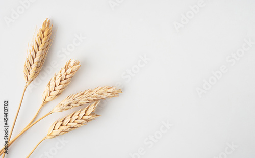 Ears of wheat on white background. Raw and vegan product. Natural food. Top view and copy space