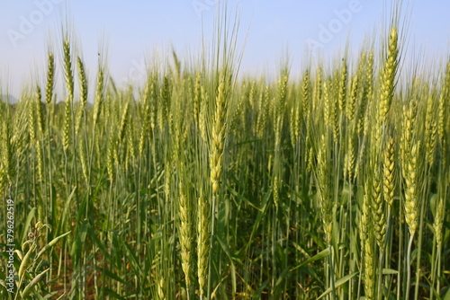 Ears of wheat plants. Panoramic view of green field of wheat a clear sunny day. Green wheat field swaying in the wind. Beautiful view of green field.