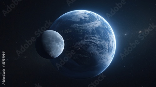 Earth and Moon from space with sunrise, showcasing blue-yellow planet hues and atmospheric glow against cosmic darkness