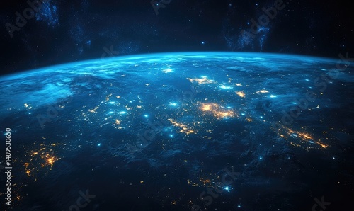 Earth at night, illuminated by city lights. Vast expanse of the planet, showcasing the glow of numerous urban areas