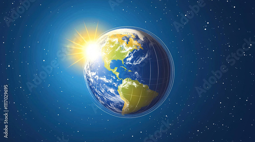 Earth axis diagram illustration showing the tilt of the Earth's rotational axis relative to its orbital plane, explaining the cause of seasonal changes and the distribution of sunlight.