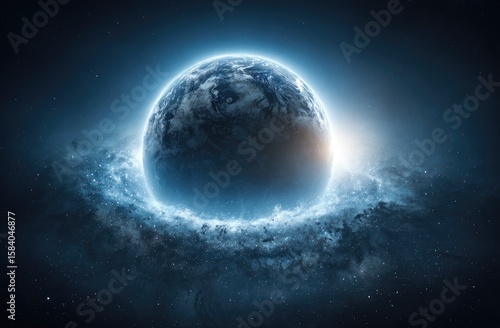 Earth bathed in ethereal light, surrounded by cosmic nebula
