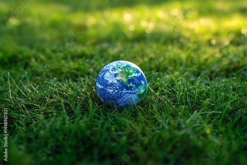 Earth Day A miniature globe rests gently on vibrant green grass bathed in soft sunlight representing our precious planet