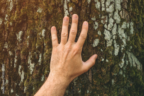 Earth day concept, closeup of male environmentalist hand gently touching the large tree trunk crust