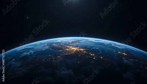 Earth from Space at Night with City Lights Illuminating the Surface
