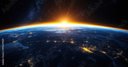 Earth from space during a sunrise with city lights and the Milky Way galaxy in the background
