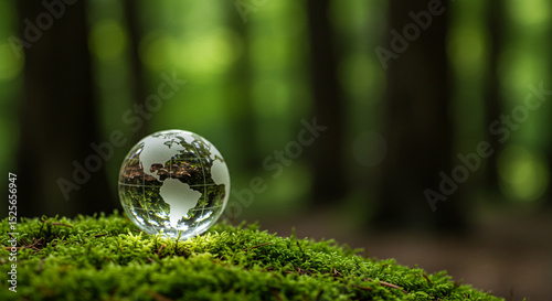 Earth globe on moss in forest represents environment conservation concept in nature