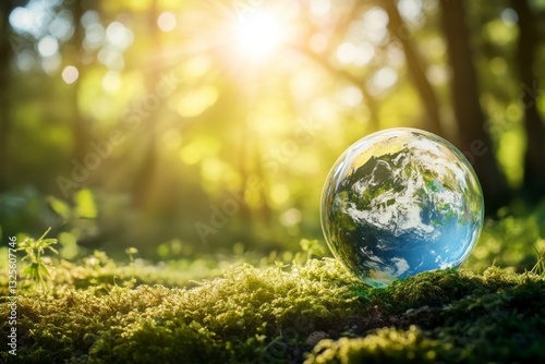 Earth Globe on Moss in Sunlit Forest Environment Concept