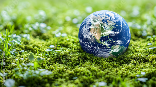 Earth globe resting on lush green moss.