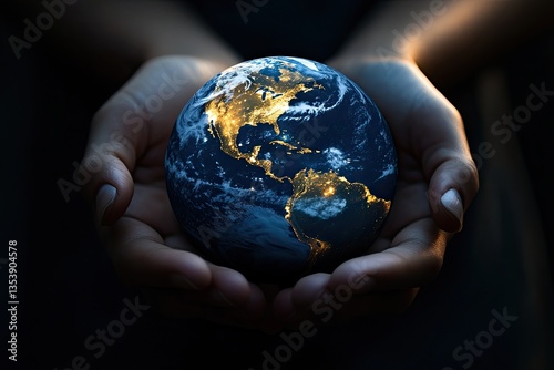 Earth held gently in cupped hands. A representation of the world, cherished and protected, with a focus on its delicate beauty and the responsibility we have towards its well-being