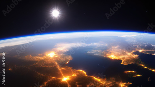 earth planet at night viewed from space with white city lights showing activity, Generative AI