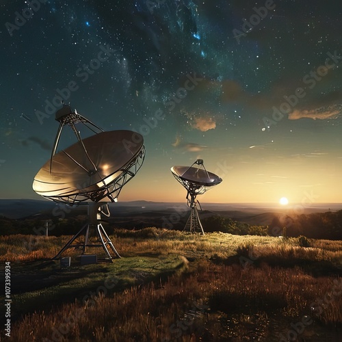 Earth receiving station in a remote desert location, where satellite signals are decoded and transmitted to control centers. The scene symbolizes global connectivity and the seamless flow of informati