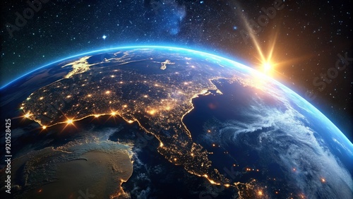 Earth seen from outer space with glowing city lights at night, planet, space, atmosphere, universe, globe, city lights, night