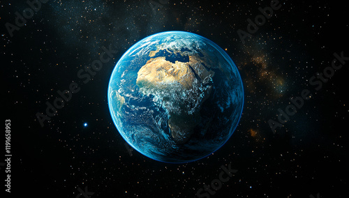 Earth seen from space with rich details. A stunning view of Earth from space showcasing continents, oceans, and cloud formations against a starry backdrop.