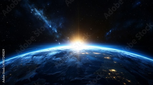 Earth sunrise from space, vast universe backdrop