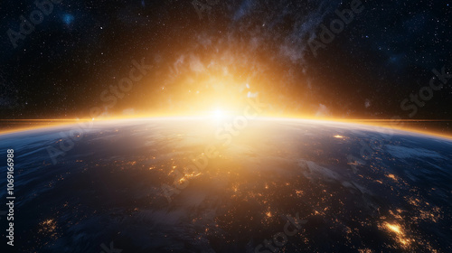 Earthrise: A breathtaking view of Earth from space, bathed in the golden glow of a rising sun. The image evokes a sense of wonder, majesty, and the fragility of our planet.