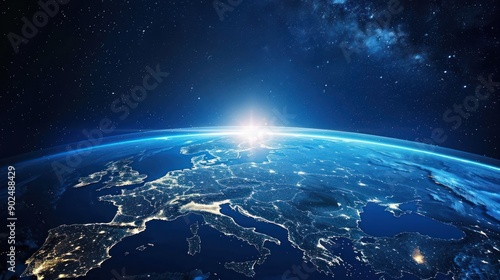 Earth's Surface with Europe Illuminated at Night with Stars and the Milky Way