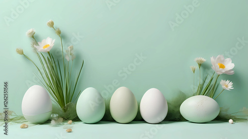 Easter abstract background. plants, eggs and flowers. Modern style design, pastel green