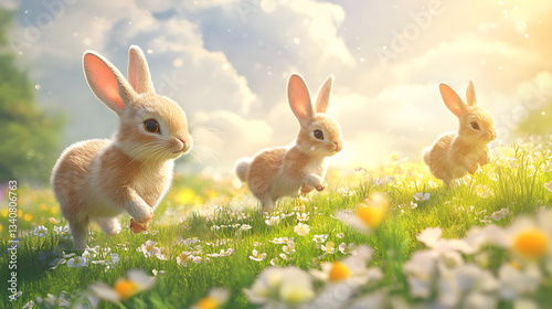 Easter bunnies playing tag in a blooming meadow on a sunny spring day.