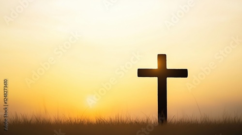 Easter Concepts. Silhouette of a cross at sunrise on a serene landscape.