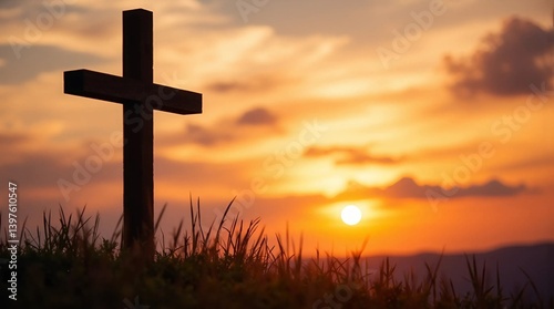 Easter cross with a beautiful sky background, bathed in sunset light, symbolizing Christian faith, resurrection, and spiritual reflection.